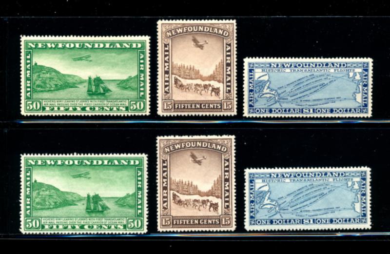 NEWFOUNDLAND 1931 #C6-11 STAMPS VF */**. Airmail stamps, "Pictorial issues" complete sets with and without watermark. The stamps are mint and numbers C6 and C9 are never hinged. Unitrade $380.00. (Image1)