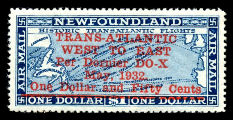 NEWFOUNDLAND 1932 #C12 STAMP VF *. Historic Transatlantic Flights, "Dornier Do-X Flight" issue. The stamp is mint lightly hinged. Unitrade $400.00. (Image1)