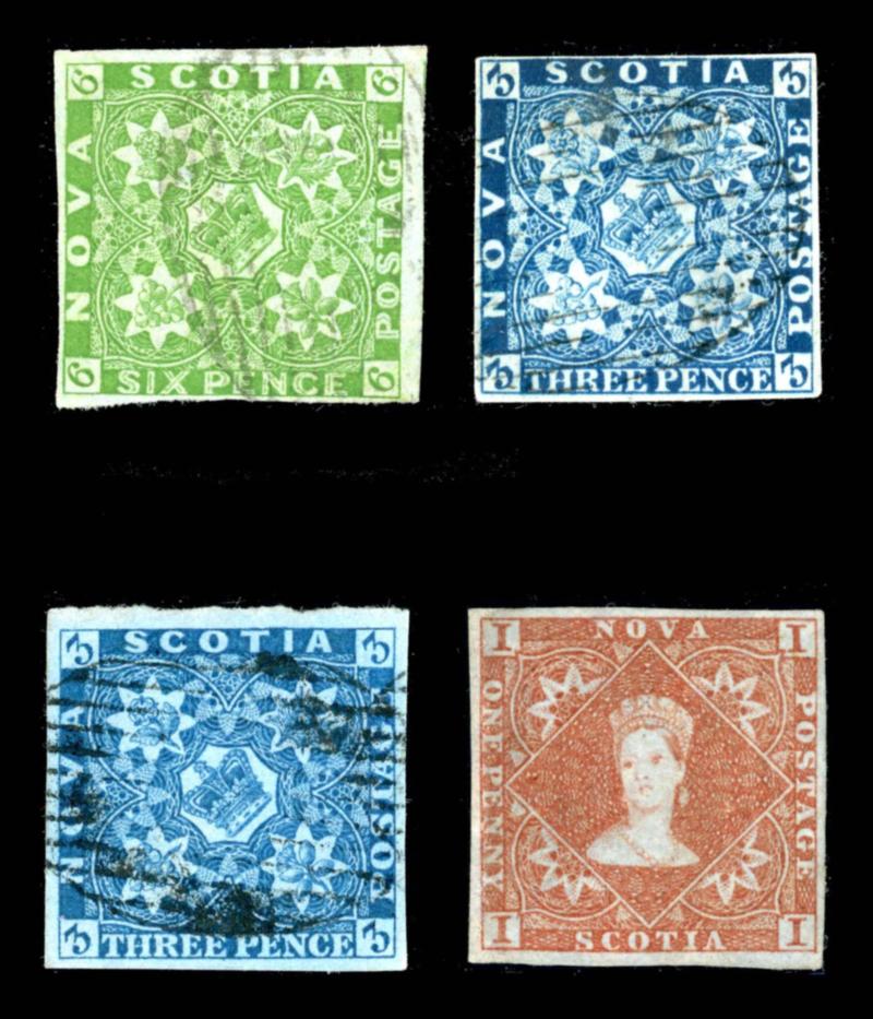 NOVA SCOTIA 1851-57 #1-4 STAMPS VG-F /O. Pence issue, selection of 4 stamps canceled and imperforate. #1 with 4 margins and a light thin on right side, #2 with 4 margins, #3 with 4 close margins and #4 with 4 margins close at bottom right. Unitrade $1200.00. (Image1)