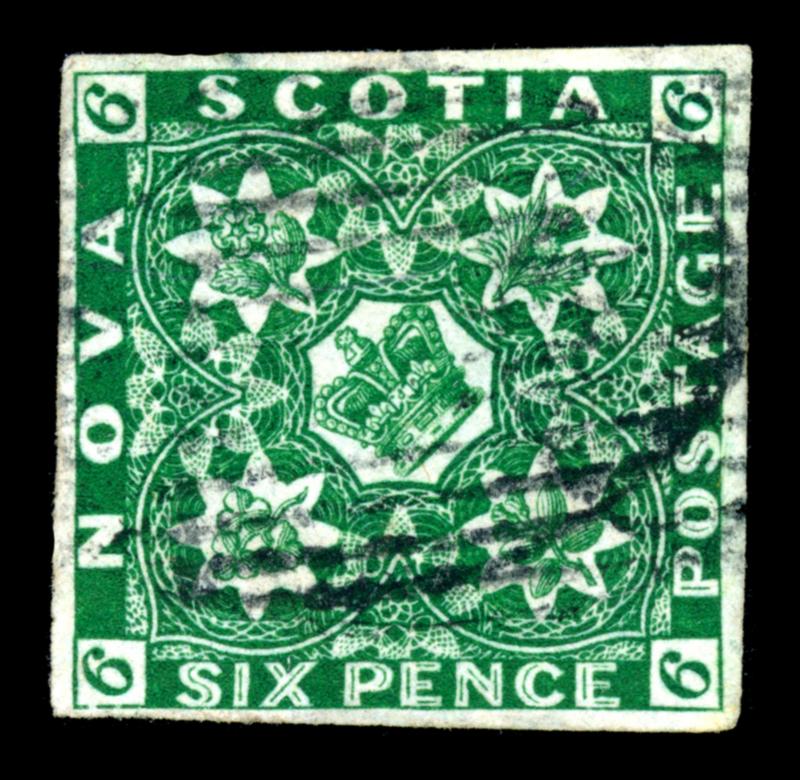 NOVA SCOTIA 1857 #5 STAMP F /O. 6 pence dark green Heraldic Flowers and Crown, the stamp is canceled with two tiny central thins. Still a nice stamp. 2018 Vincent Greene Foundation certificate. Unitrade $1500.00. (Image1)