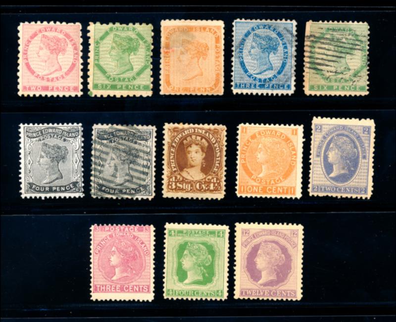 PRINCE EDWARD ISLAND 1861-72 SELECTION STAMPS VG-F */O. Selection of 13 stamps mint and canceled. Numbers are 1* (reperforated), 3* (reperforated), 4(*), 6/o, 7/o, 9*, 9/o, 10*, 11*, 12*, 13*, 14*, 16*. Starting bid $100.00. (Image1)