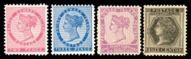 PRINCE EDWARD ISLAND 1862-72 SELECTION STAMPS F-VF **. Selection of 4 stamps mint never hinged. Numbers are 5 (F-VF), 6 (F), 8 (VF) and 15 (F). Unitrade $340.00. (Image1)