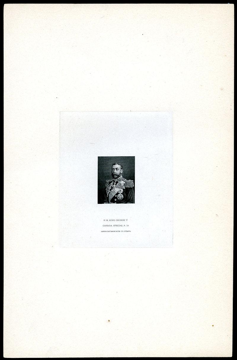 1915 King George V LARGE DIE ESAY, black on india (73 x 88) die sunk on large card 150 x 230mm, H.M. KING GEORGE V "CANADA SPECIAL A. 19" AMERICAN BANK NOTE CO. OTTAWA, small foxing spot, still very fine. (Image)