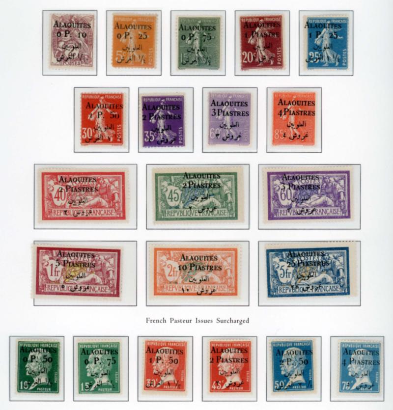 ALAOUITES 1925-30 COLLECTION STAMPS F-VF */**. Collection of 65 mint stamps mounted on Palau album pages. I noted numbers 1-15*/**, 16-21*/**, 25-37*/**, C9-12*, J1-5** and J6-10*. Scott $540.00 CAD. (Image1)