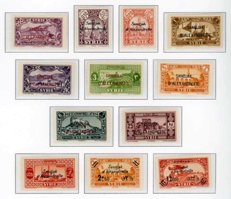 ALEXANDRETTA 1938 COLLECTION STAMPS F-VF */**. Collection of 26 mint stamps mounted on Palau album pages. I noted numbers 1-12/*, C1-8*, J1-6*/**. Scott $365.00 CAD. (Image1)