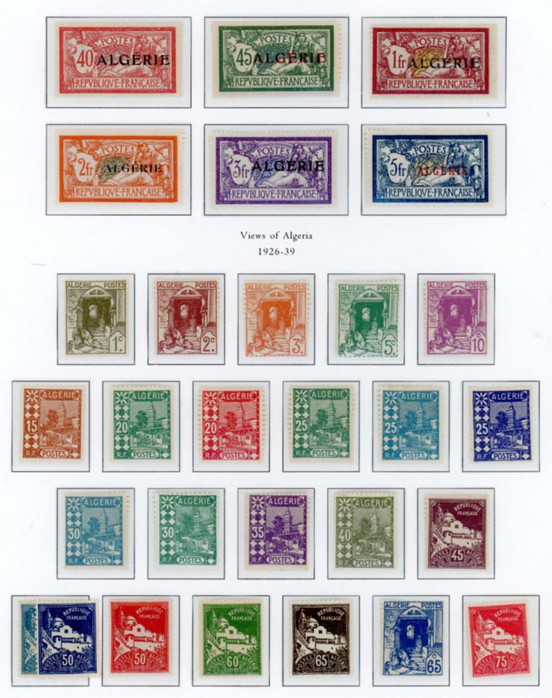 ALGERIA 1924-58 COLLECTION STAMPS F-VF */**. Very nice and complete collection (missing 1 stamp) for the period of 457 mint stamps, mounted on Palau hingeless album pages. I noted numbers 1-32**, 33-67*/**, 79-108**, 285**, B1-13*, B14-26**, B28-31**, C8-11**. Scott $1960.00 CAD. (Image1)