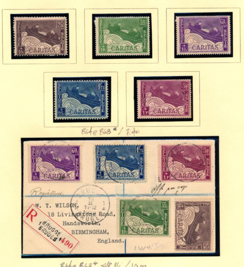 BELGIUM 1927-55 COLLECTION STAMPS COVERS VF */**/O. Album containing a nice and interesting collection on semi-postal and charity stamps. I counted 228 stamps, 15 souvenir sheet, 10 covers and 22 postcards. I noted #212-14/o, 222-24*, 222-24 on registered cover with Antwerp International exhibition postmark, 229-36*/o, 316-21 on first day registered cover, B64-67 on registered cover, B68** in full sheet of 10, B78/83*, B200-07 on first day registered cover, B208/o first day postmark, B208a*, B214-20 on first day registered cover, B225-32*, B233-40 on registered cover, B256-63*, B273-78**, B279* perf. and imperf., B315-16*, B571-72 on illustrated cover, souvenir cards and Cinderella stamps from 1930 plus vintage postcards. Need to be seen. Starting bid $300.00 (Image1)