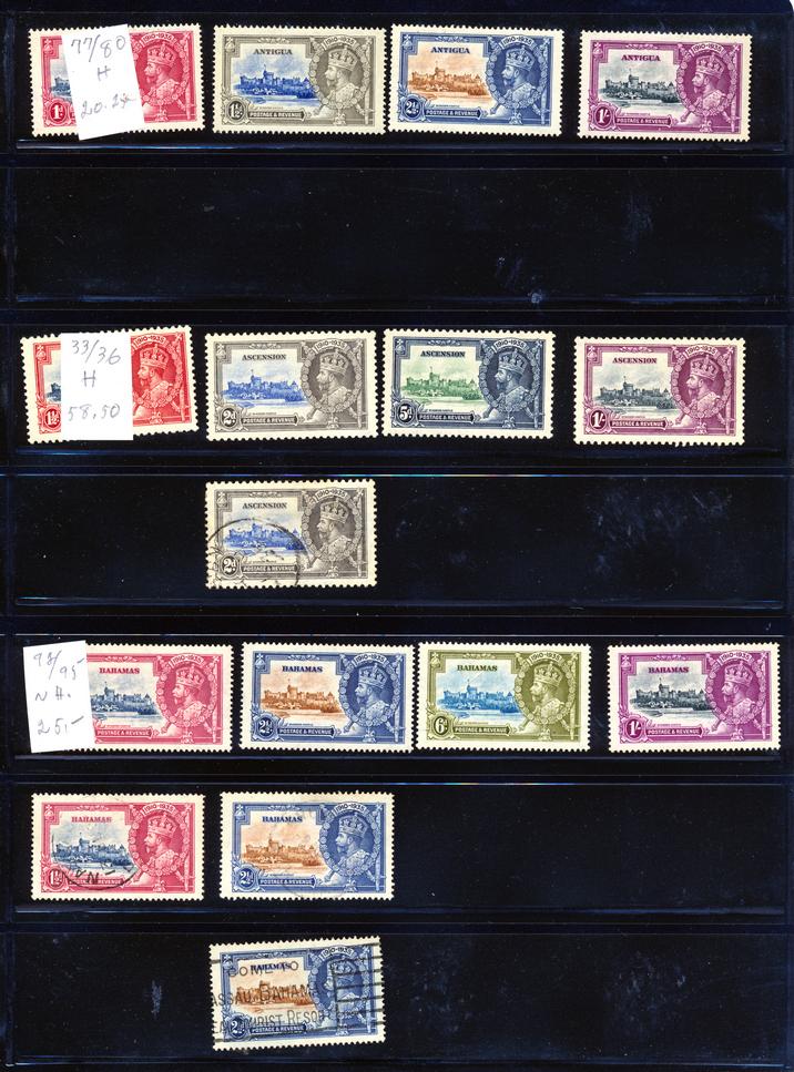 BRITISH COLONIES 1935 + 1946 OMNIBUS ISSUES F-VF */**/O. Binder containing stamps mint and used from the 1935 Silver Jubilee and the 1946 Peace issues. I noted Antigua #77-80*, Ascension #33-36*, Australia #152-54**, Bahamas 92-95**, Barbados 186-89*, Basutoland 11-14**, Bechuanaland #117-20**, Bermuda #100-03 *, British Guiana #223-26*, British Honduras #108-11**, Cayman Islands #81-84**, Ceylon #260-63/o x2, Cyprus #136-39*, Dominica #90-93*, Falkland Islands #77-80*, Fiji #110-13*, Gibraltar #100-03*, Gilbert & Ellice Islands**, Gold Coast #108-11**, Grenada #124-27*, Hong Kong #147-50*, #147-50/o x2, Jamaica #109-12*, Leeward Islands #96-99**, Malta #184-87*, Mauritius #204-07*, Montserrat #85-88*, Newfoundland #226-29*, Northern Rhodesia #18-21**, Nyasaland #47-50*, St. Helena #111-14**, St. Christopher & Nevis #72-75**, Nigeria #91-94, St. Vincent #134-37*, Seychelles #118-21*, Sierra Leone #166-69*, Solomon Islands #60-63**, Somaliland #77-80*, South Africa #68-72** Pairs, Southern Rhodesia 33-36*, Straits settlements #213-16*, Trinidad & Tobago #43-46/o. Virgin Islands**, +++ many doubles in both issues. Scott value $2225.00 CAD ++. (Image1)