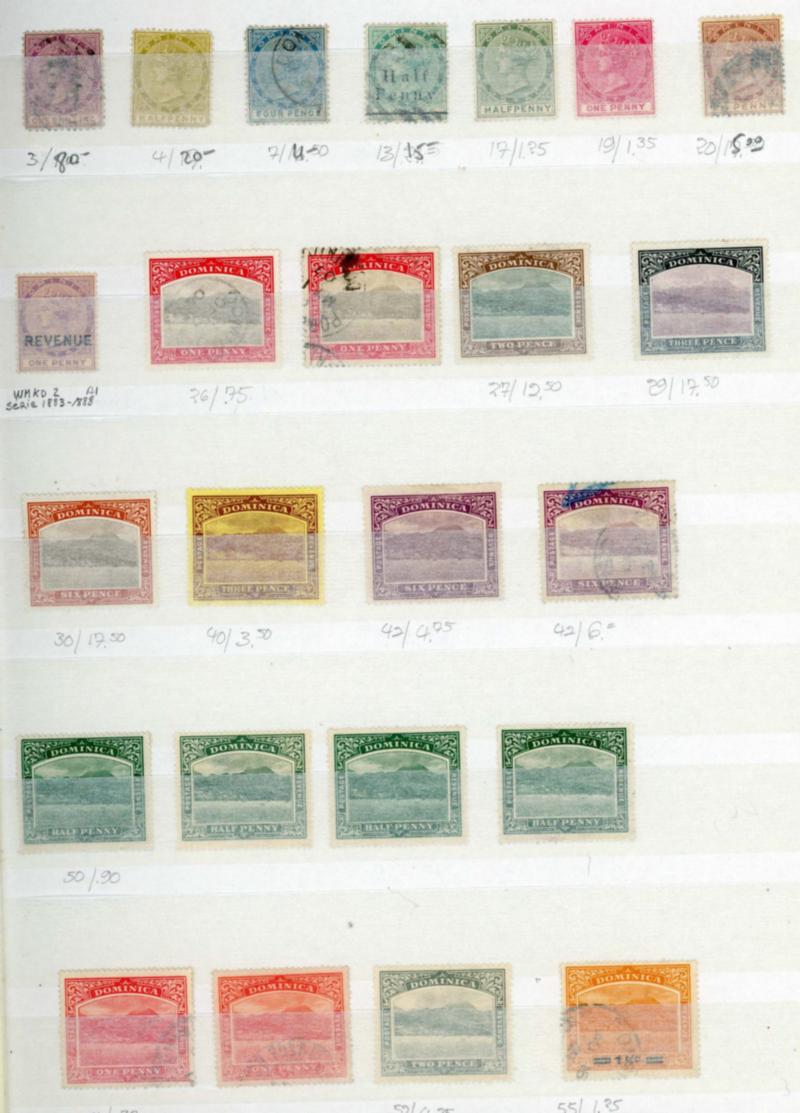 BRITISH COLONIES LOT STAMPS F */O. Stockbook containing 965 stamps mint and used (identified with Scott numbers) from Dominica, East Africa and Uganda Protectorate, Falkland Islands, Fiji, Gambia, Gibraltar, Gilbert and Ellice islands, Gold Coast, Grenada, Hong Kong and India. Has to be checked. Owner's catalog value, Scott $5680.00 CAD. (Image1)