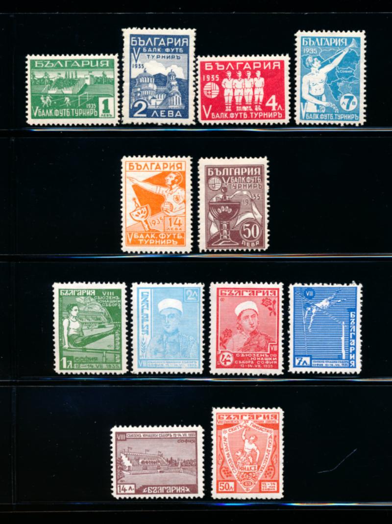 BULGARIA 1935 #267-78 STAMPS F-VF */**. 5th Balkan Soccer and 8th Yunak gymnastic tournaments issues. 2 complete set of 6 mint stamps. Numbers 267-72 are hinged and numbers 273-78 are never hinged. Scott $490.00 CAD. (Image1)
