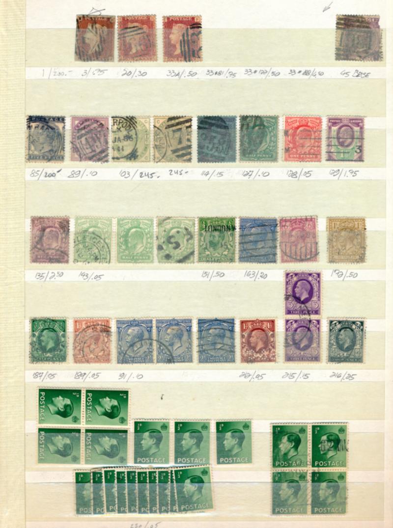 GREAT BRITAIN 1840-1980 COLLECTION STAMPS VG-VF */**/O. Stockbook containing approximately 800 stamps mint and used. Must be checked, condition for the Victoria stamps is mixed. I noted numbers 1 to 3 in VG condition. High catalog value. The modern stamps are almost all mint never hinged. Starting bid $200.00. (Image1)