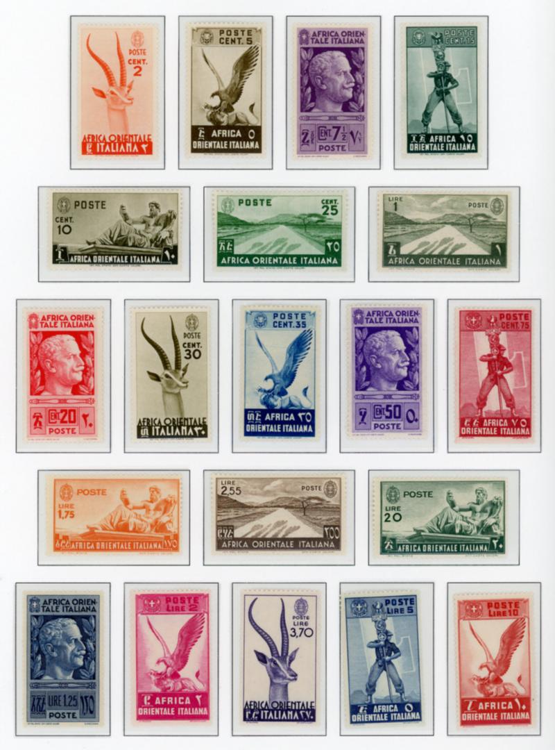 ITALIAN EAST AFRICA 1938-40 COLLECTION STAMPS F-VF **. Palau album hingeless pages containing a collection of 62 stamps mint never hinged. Need to be examined. I noted numbers 1-20**, 34-40**, C1-17**, E1-2**. Scott $660.00 CAD. (Image1)
