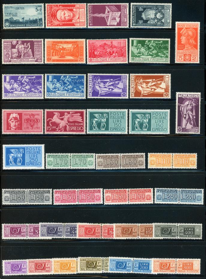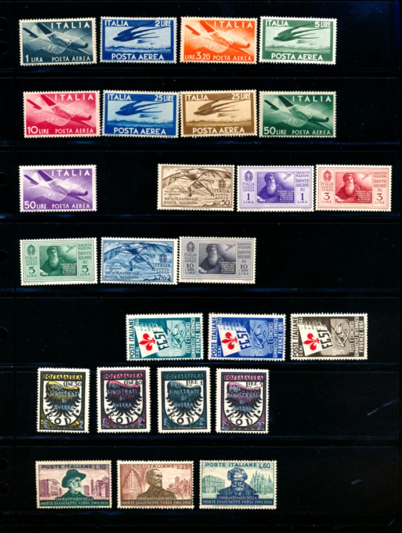 ITALY 1922-51 SELECTION STAMPS F-VF */**. Selection of 40 mint stamps. Numbers are: 140-42** (142*), 514**, 574-76*, 594-95**, B20-25*, B26-29**, C28-33*, C106-14**, Rhodes CB1-4*. Scott $788.00 CAD. (Image1)