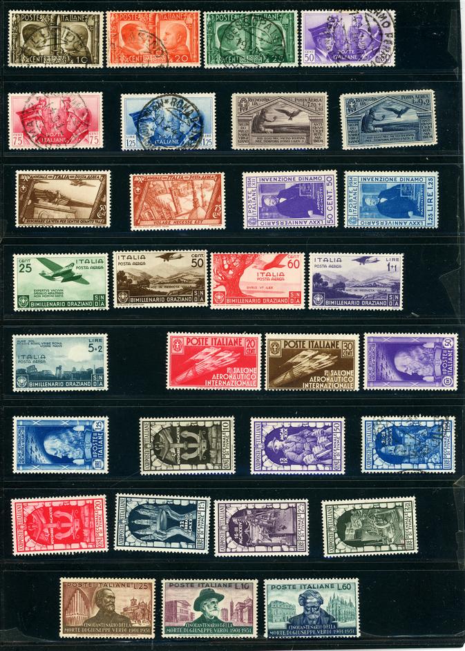 ITALY 1903-51 SELECTION STAMPS F-VF */**/O. Selection of 46 stamps mint and used. I noted numbers #345-48*, 413-18/o, 514**, 594-96**, C25**, C26**, C84-88*, J22/o, J24/o. Scott $1050.00 CAD. (Image1)