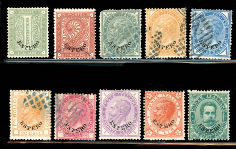 ITALY OFFICES ABROAD 1874-81 SELECTION STAMPS F */O. General issue, Italian stamps overprinted "ESTERO". Selection of 10 stamps, numbers are: 1(*), 2-5/o, 7/o, 9/o, 10(*), 11* and 12*. Scott $1100.00 CAD. (Image1)
