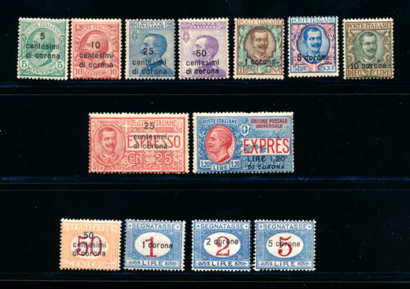 ITALY 1921-22 DALMATIA SELECTION STAMPS F */**. Selection of 13 stamps. The numbers are: 2-8*, E1-E2** and J1-J4**. Scott does not indicate price for never hinged stamps. Scott $460.00 CAD, Michel $2800.00. Starting bid $150.00. (Image1)