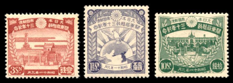 JAPAN 1936 #227-29 STAMPS VF **. 30th Anniversary of Japanese administration of Kwantung leased territory, set of 3 stamps mint never hinged. Scott $310.00 CAD. (Image1)