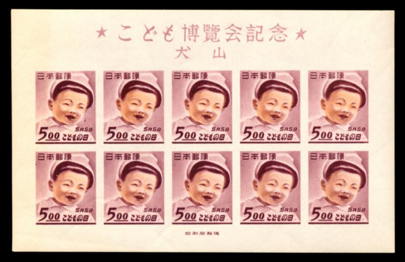JAPAN 1949 #456 SOUVENIR SHEET F-VF **. Children's exhibition issue, souvenir sheet of 10 stamps mints never hinged (defect on gum bottom left corner). Scott $600.00 CAD. (Image1)