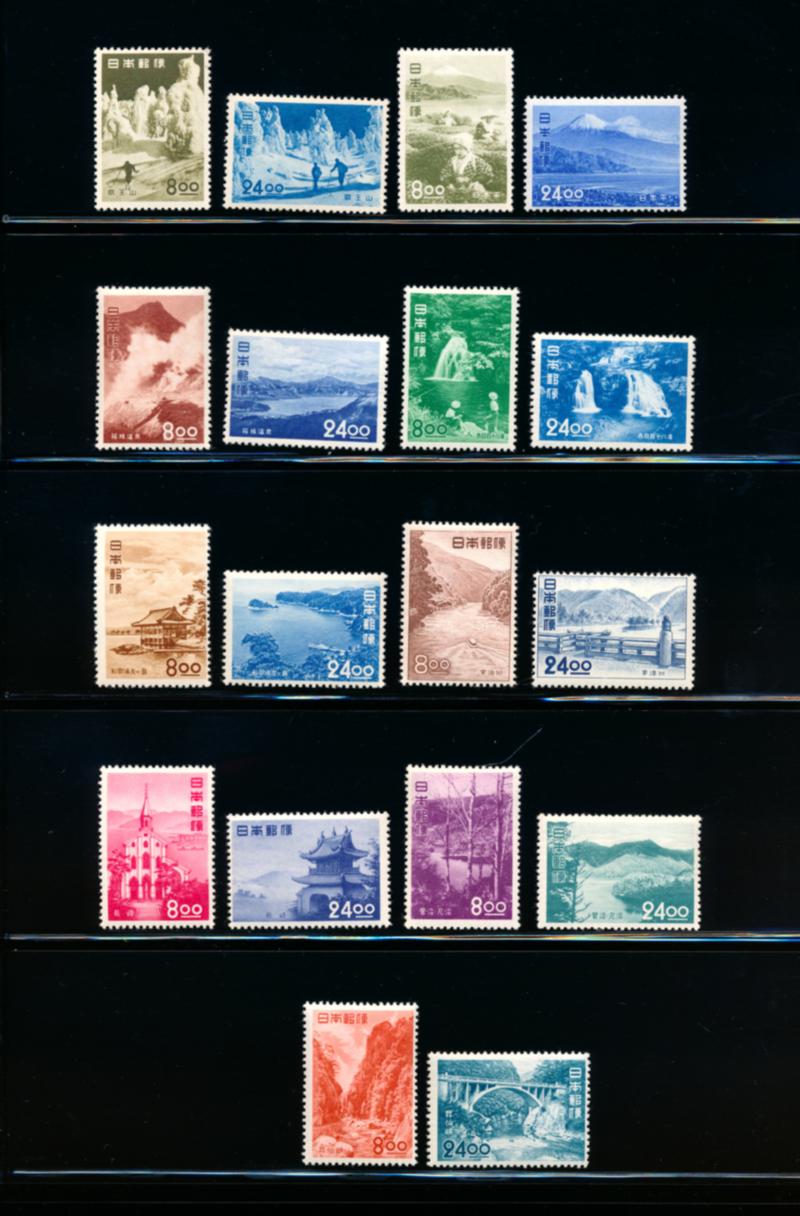 JAPAN 1951 #523-41 STAMPS VF **. Scenic Spots issue; complete set of 18 stamps mint never hinged. Scott $380.00 CAD. (Image1)