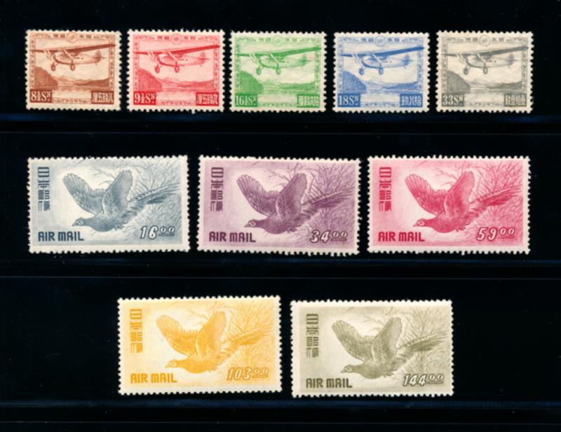 JAPAN 1929-50 #C3-13 STAMPS VF *. Airmail issues, 2 complete sets, numbers C3-8 and C9-13. The stamps are mint hinged. Scott $380.00 CAD. (Image1)