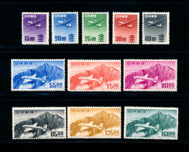 JAPAN 1951-52 #C14-24 STAMPS VF **. Airmail issue, complete set of 11 stamps mint never hinged (C24 with light spot of disturbed gum). Scott $880.00 CAD. (Image1)