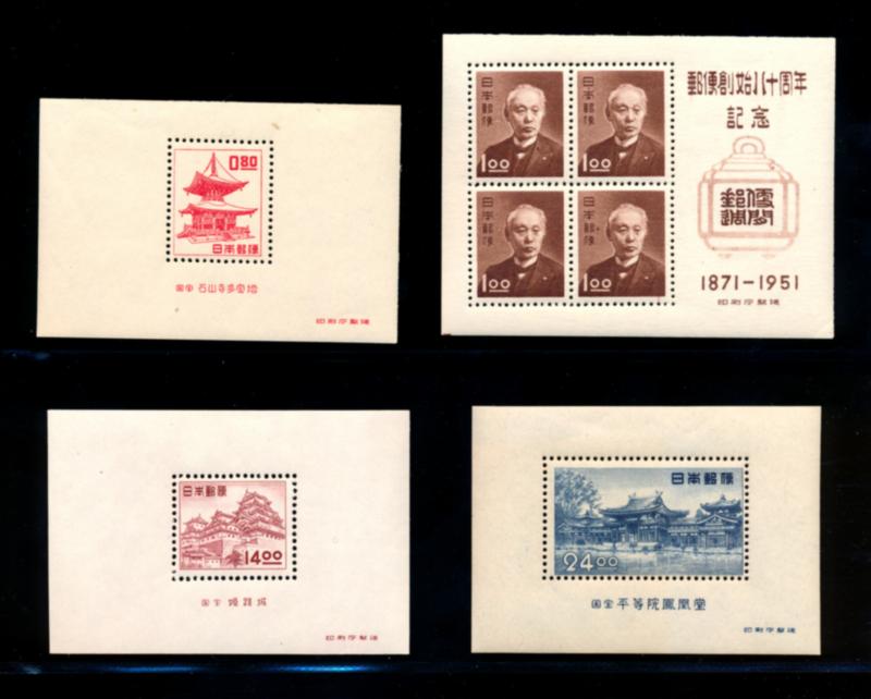 JAPAN 1950-1952 SOUVENIR SHEETS VF **. Selection of 4 mint never hinged Souvenir sheets from the 1950-52 Definitive issue. Numbers are: #509a, 510a, 517a, and 519a. Scott $250.00 CAD. (Image1)