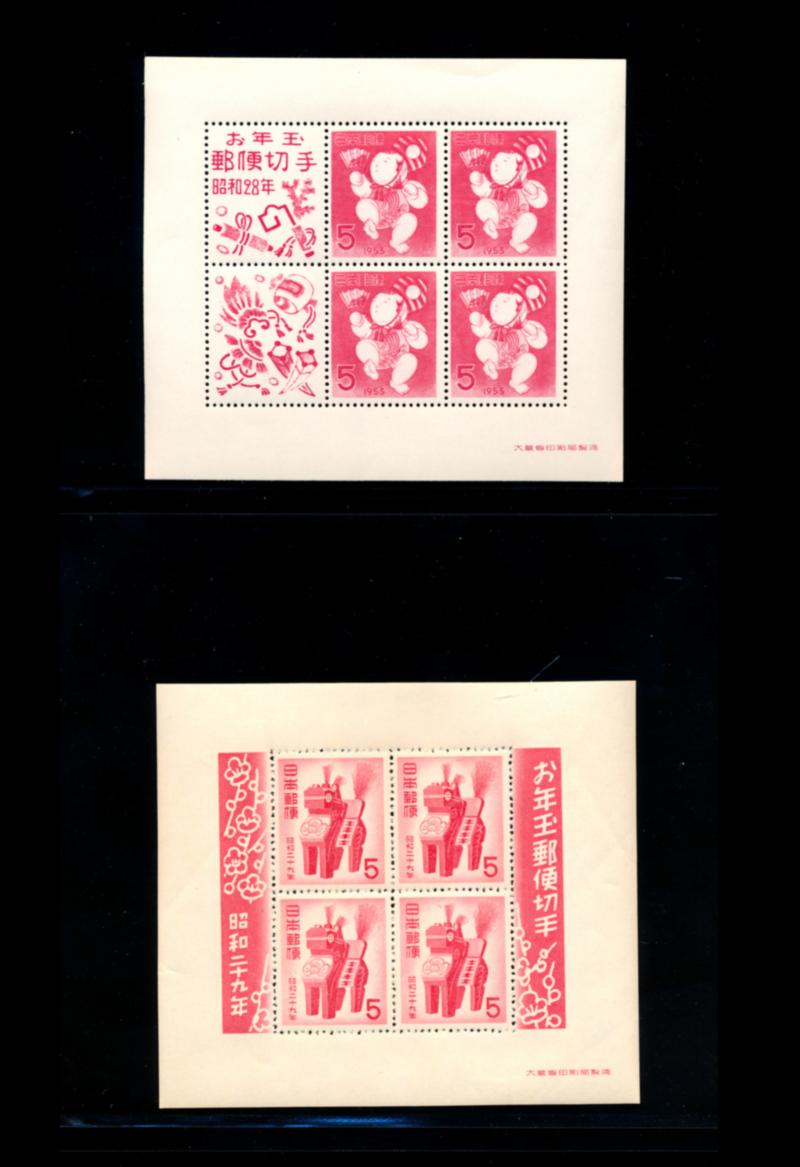 JAPAN 1952-1955 SELECTION SOUVENIR SHEETS VF ** Selection of 7 souvenir sheets mint never hinged. Numbers are: #551a, 576a, 582a, 594a, 606a, 617a and B11. Scott $650.00 CAD. (Image1)