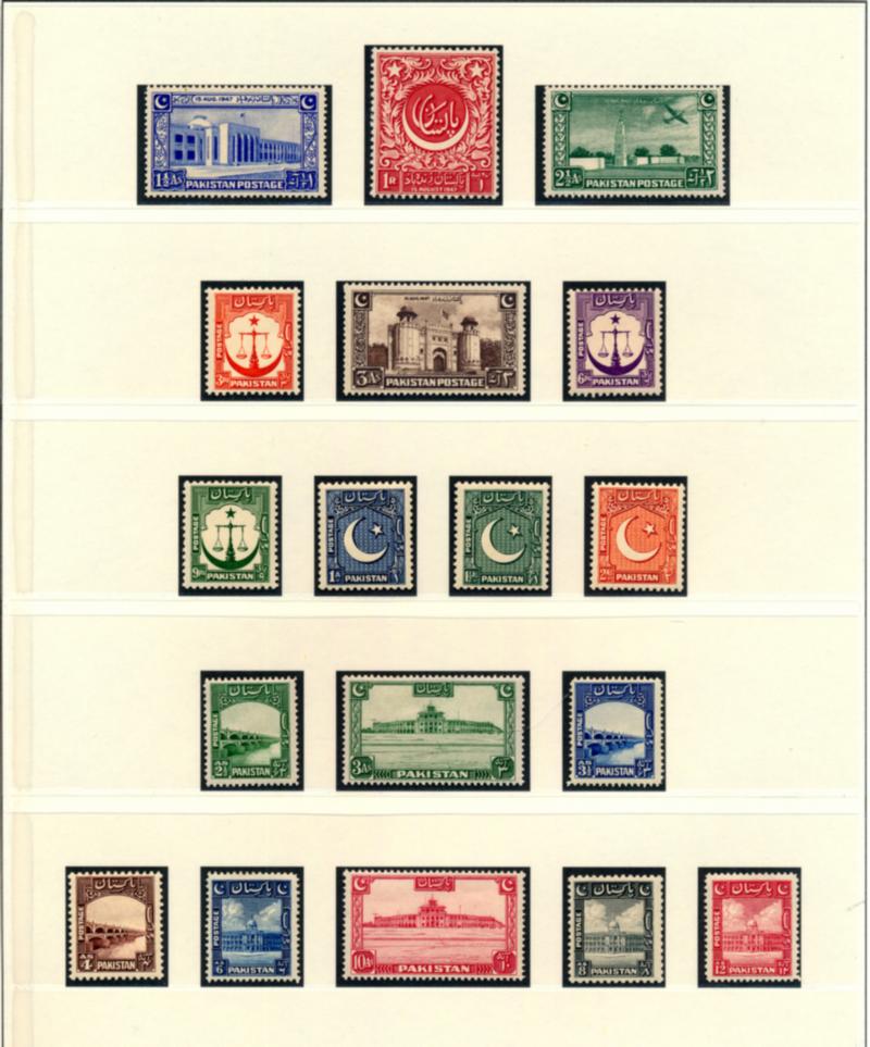 PAKISTAN 1947-82 COLLECTION STAMPS F-VF */**/O. Lindner hingeless album containing 591 stamps and 4 souvenir sheets, mint and used. Need to be examined. I noted numbers 24-43*, 47-54*, 56-62**, 66-72**, Bahawalpur 2/15*. Starting bid $150.00. (Image1)