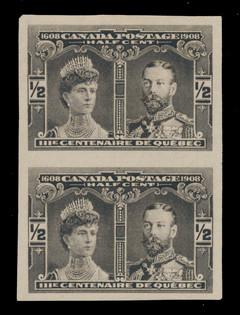 1908 ½c Black Brown Québec Tercentenary Imperforate, a mint hinged vertical pair with large, even margins, very fine. (Image)