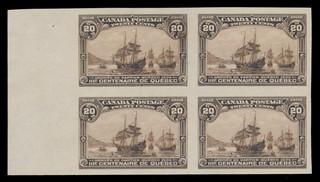 1908 ½c to 20c Québec Tercentenary Set, Imperforate, each value is in a sheet margin block of four, except for the 10c which is without sheet margin, all from a first printing, with deeper shades and without gum, as issued. The 20c block also shows the major re-entry on the upper left stamp. The 1c block has a spot on back, and the 20c has a minor wrinkle, still an extremely fine and major rarity of Canadian philately. (Image)