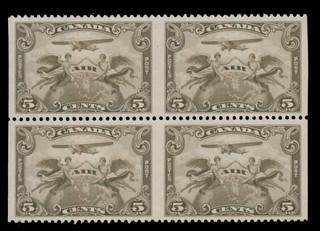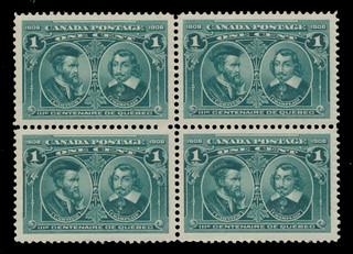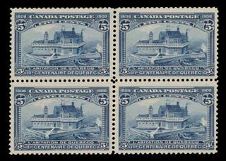 1908 5c Blue Québec Tercentenary, a mint never hinged block of four, quite fresh in all respects and overall fine-very fine. (Image)