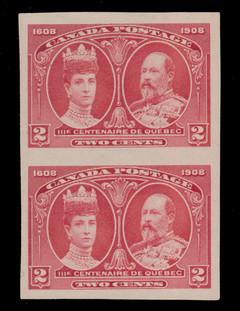 1908 2c Carmine Québec Tercentenary Imperforate, a mint hinged vertical pair, with large and even margins, extremely fine. (Image)