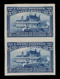 1908 5c Blue Québec Tercentenary Imperforate, a mint hinged vertical pair, with large and even margins, extremely fine. (Image)