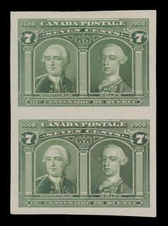 1908 7c Olive Green Québec Tercentenary Imperforate, a mint hinged vertical pair, with large and even margins, extremely fine. (Image)