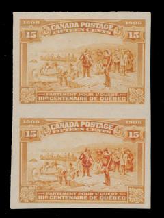 1908 15c Orange Québec Tercentenary Imperforate, a mint hinged vertical pair, with large margins and some discolouration, else very fine. (Image)