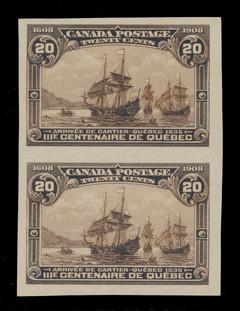 1908 20c Brown Québec Tercentenary Imperforate, an unused (no gum, as issued) vertical pair, with large margins, very fine. (Image)