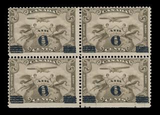 1932 6c on 5c Air Mail Surcharge, with Double Surcharge, a mint hinged block of four with natural straight edge at bottom, clearly showing the double print, off-centre as are all genuine examples, fine. A rare variety in block format and the first we have encountered.