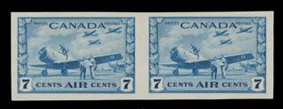 1943 7c Deep Blue Air Mail, Imperforate, a mint never hinged horizontal pair, with small portion of "Sanabria" guarantee handstamp on back, very fine. Rare, with only 50 pairs issued. (Image)