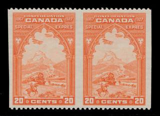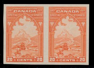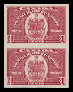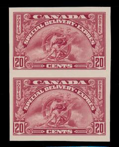1935 20c Dark Carmine Special Delivery, Imperforate, a mint never hinged vertical pair, fresh and extremely fine. Scarce, with only 75 pairs issued. (Image)