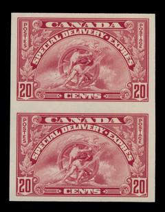 1938 20c Dark Carmine Special Delivery, Imperforate, a mint never hinged vertical pair, fresh and extremely fine. Scarce, with only 75 pairs issued. (Image)