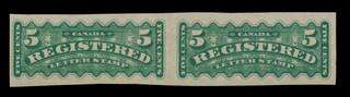 1908 1c Green Québec Tercentenary Imperforate, a mint hinged vertical pair, with large and even margins, interestingly showing hairline cracks in margin at right, extremely fine. (Image)