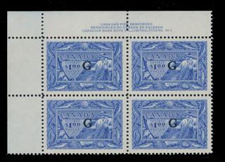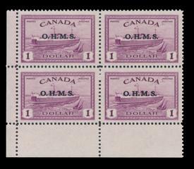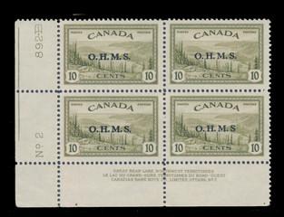 1949 10c Great Bear Lake Official with O.H.M.S. Overprint, with "Missing Period After S Variety", a mint never hinged lower left corner plate 2 block of four, variety is on the lower right stamp, very fine. (Image)