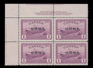 1950 $1 Train Ferry Official with O.H.M.S. Overprint, a mint never hinged lower left corner plate 1 block of four, very fine. (Image)
