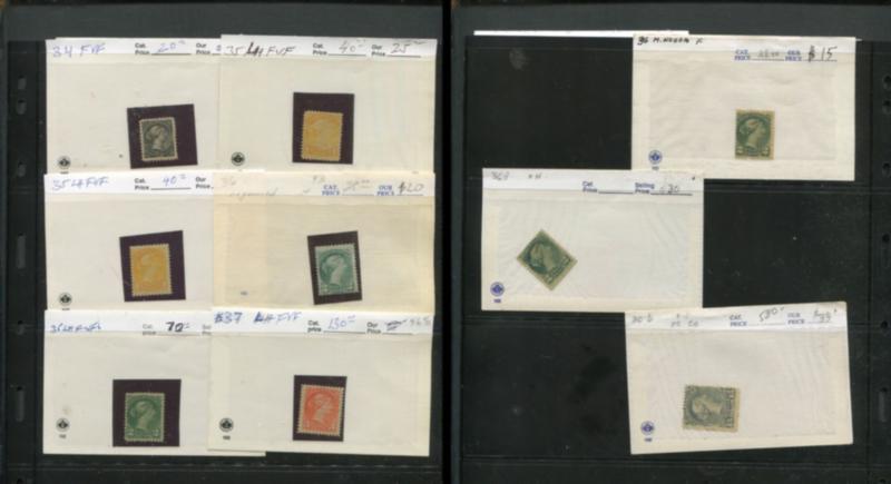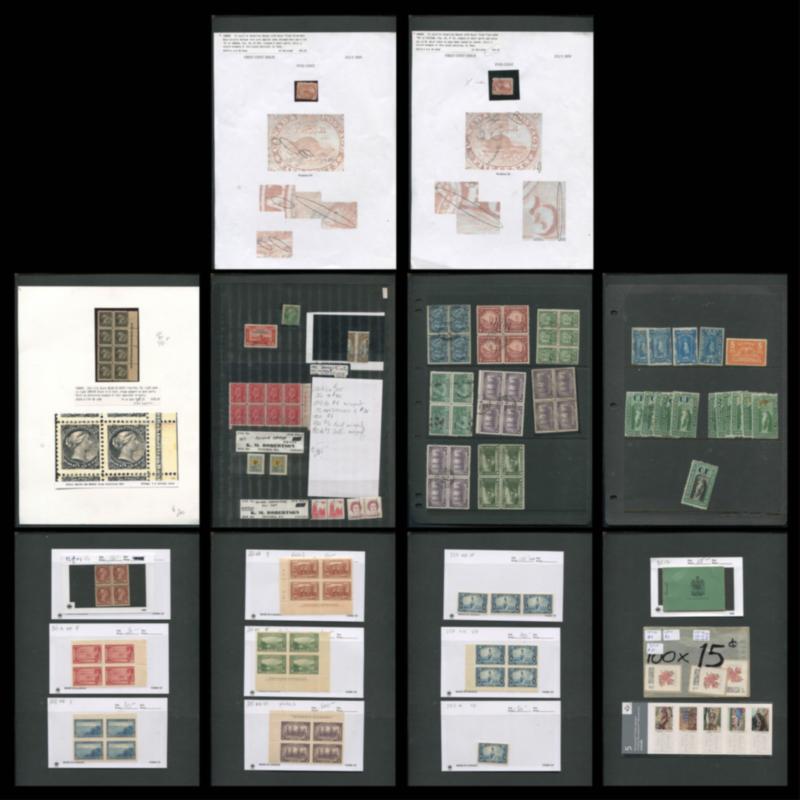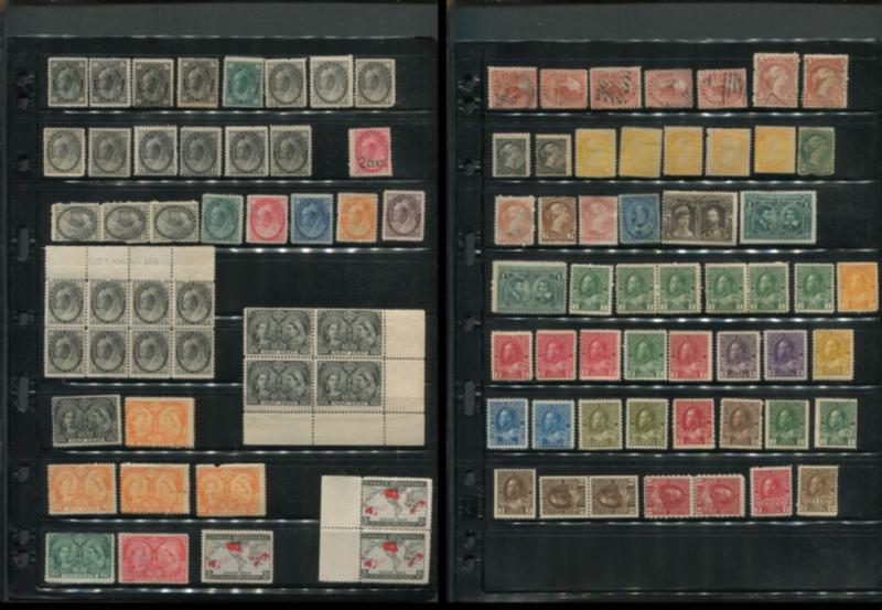 A used dealer stock in identified 102's, housed in a binder from 1870-1999 #34/#1789, plus BOB issues. Contains Small Queens with a couple pairs and strips, #47, some nicely centred Victoria Leafs, Edwards including #94-#95, #100, #101 (2), Admirals including #124 (2), #126, #136-#137, #159 (2), #177 (2), #179 strip of 4, #227 (3), #262 (3), some Airs/Special Delivery/Dues/G's/OHMS Pefins, some modern material, etc. A good mix of material with plenty of overall value. (Image)