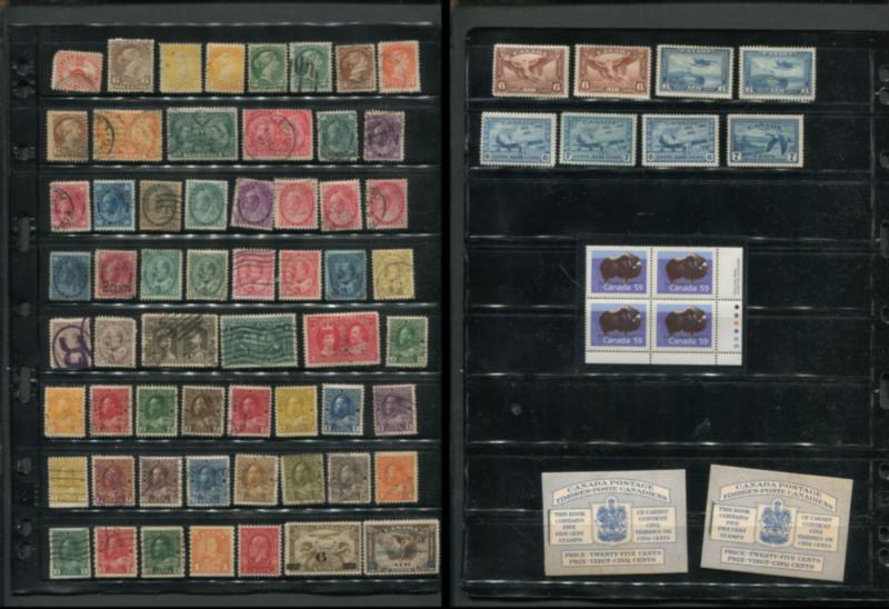 Canada mixed lot of Mint NH, H, used, Small Queens, to Centennial issue, and back of book issues, est. Cat. 1270, Small queens, low value Jubilees, Admirals/Peace issue, Centennial issue incl. Plate blocks, special presentation booklet signed by the Postmaster General, back of book issues, Air mails C1-C9, Officials OHMS and G, few precancels, Postage dues incl. J21-J27 most on matched Plate Block sets, Many Christmas and Easter Seals in mini sheets, 1 unopened roll of #2397 coils, 1 BK 148, 1 blue 1897 series 1 Pound Tobacco duty with 7 strips attached, an interesting accumulation lot well worth the estimate (Image)