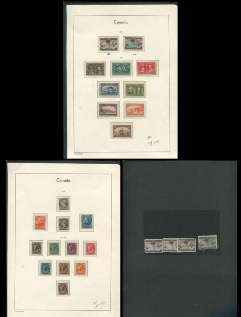 Canada collection, 1893-1898, Small Queen, QV Maple leaf, Maps, Quebec Tercentenary, Unitrade Cat. $2475, $1735 USD, MNH and MH, 2 shades of SQ 8c, 20c and 50c Widow weeds, complete set of QV Maple leaf and Tercentenary, a nice collection. graded as fine. (Image)