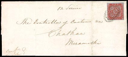 New Brunswick, 1851, 3d red. Four large balanced margins, deep color & nice impression, tied by barred numeral "1" handstamp to 1858 folded letter from St John to Miramichi, manuscript "On Service" endorsement at top, backstamped "St. John, My 4, 1858" cds and blue "Chatham, My 6, 1858" transit cds, a Very Fine cover. Scott No. 1; Estimate $400 - 600. US$400-600 (Image)