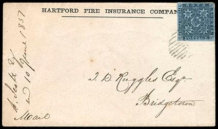 Nova Scotia, 1851, 3d bright blue. Four margins with deep rich shade, tied to 1857 "Hartford Fire Insurance Company" advertising cover by oval grid handstamp, to Bridgetown with "Halifax, Nova Scotia, Jun 6, 1857" origin cds and Bridgetown backstamp, paying the 3 pence domestic letter rate per ½ ounce, Extremely Fine,ex-Mayer, with 2015 Greene Foundation certificate. Scott No. 2; Estimate $200 - 300. US$200-300 (Image)