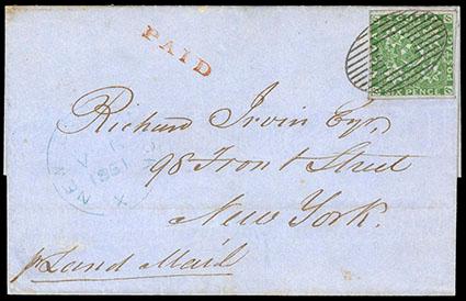 Nova Scotia, 1851, 6d yellow green. Rich color with four large balanced margins, tied to folded letter sheet from Halifax to New York with bold oval grid handstamp, light strike of blue NEW BRUNSWICK 1851 circular transit marking and manuscript "Per Land Mail", plus red "Paid" straight line on front, backstamped "Halifax, Oc 25, 1851" origin and St. John transit cds's, Extremely Fine,ex-Caspary, Mayer & Forster, with 1987 B.P.A. certificate. Scott No. 4; Estimate $1,000 - 1,500. US$1,000-1,500 (Image)