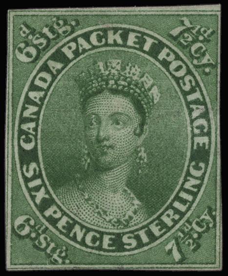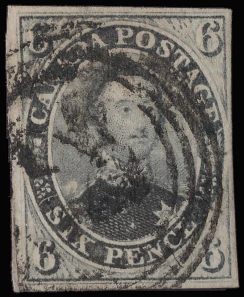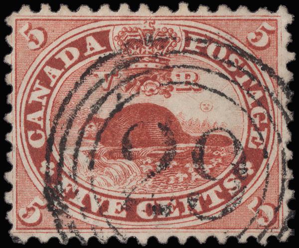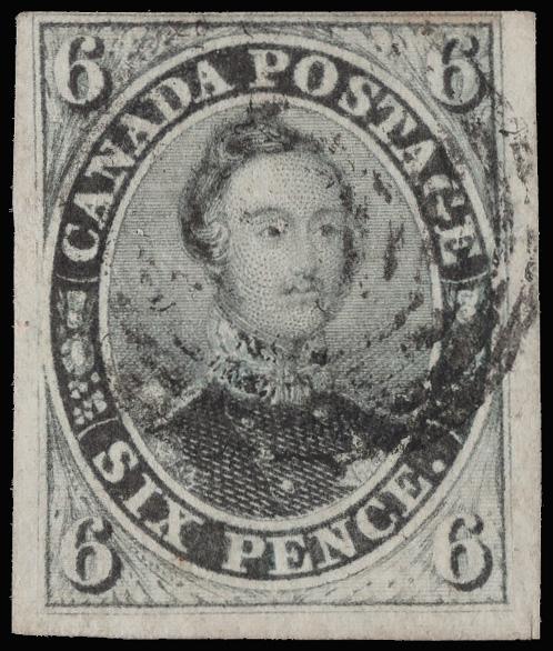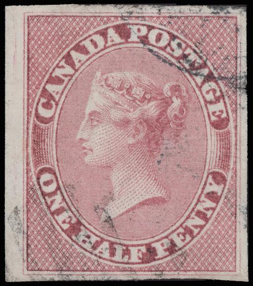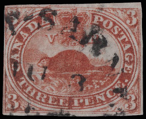 1851, Beaver, 3d red, on laid paper, imperforate, major re-entry (Unitrade 1iii), position A47 with major doubling in "EE PEN", etc., and excellent example with a "PORT-SARNIA" rimless c.d.s. cancel; three clear margins, but just shaved at the left, Fine. THE major re-entry on the 3d Beaver. Scott 1 var. Unitrade C$1,500 ($1,110). (Image)